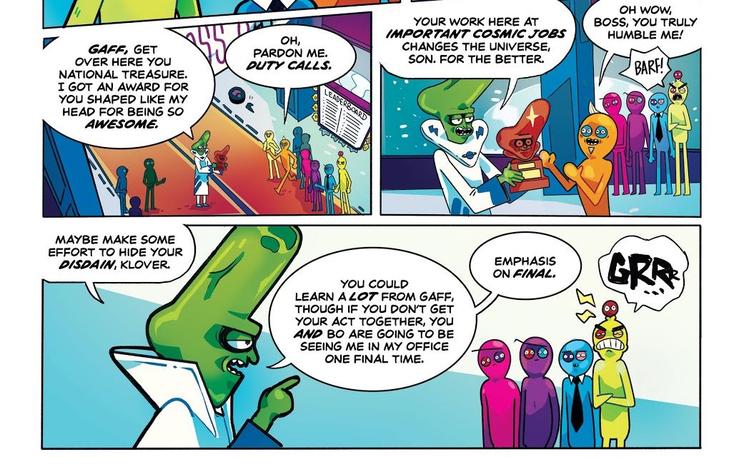 Trover Saves the Universe #1 opens at the point that the video game leaves off. Having just saved the universe from the clutches of the powerful Glorkon, Trover is taking a break with his Chairopian buddy in a bar. He starts rambling on about flashbacks and delves into the past to tell a story about two of his co-workers, Bo and Klover. Klover is a green monster alien with anger management issues, while Bo is an ambitious yet unlucky blue alien with a knack for blowing up clients and colleagues alike. The earlier management of the ICJ introduced a small but brutal rule that employees at the bottom shall be eliminated permanently, which leaves both Bo and Klover on the chopping block. Jealous of co-worker Gaff's constant success, Klover plans to sneak into his penthouse. Unbeknownst to Klover, Bo plans to do the same. However, all hell breaks loose as both Klover and Bo inevitably find themselves in trouble.